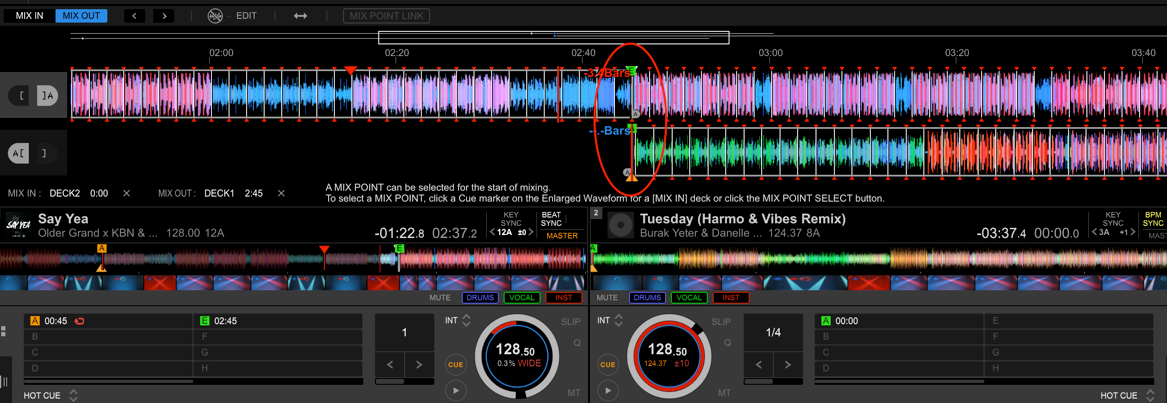Next, select MIX IN and click the Hot Cue twice on DECK 2 to set as a MIX IN point. (Not the one in the overall waveform)